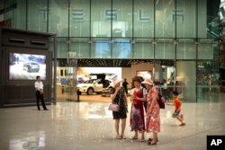 2018年7月5日,一些女士在北京一家高檔購物中心的特斯拉展廳外觀看智能手機。
