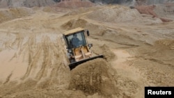 一名工人在中國江西省南城縣的稀土工地上駕駛推土機。(2012年3月14日)